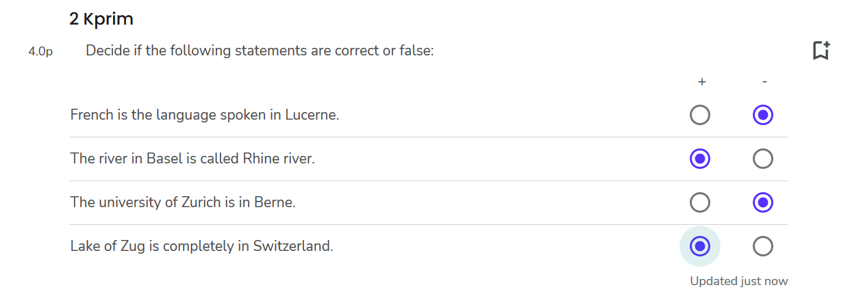 Prüfungsfortschritt speichern Generell werden Ihre Antworten alle 30 Sekunden automatisch gespeichert. Der Speichervorgang wird rechts, unterhalb der jeweiligen Frage mit "Updated just now" angezeigt: