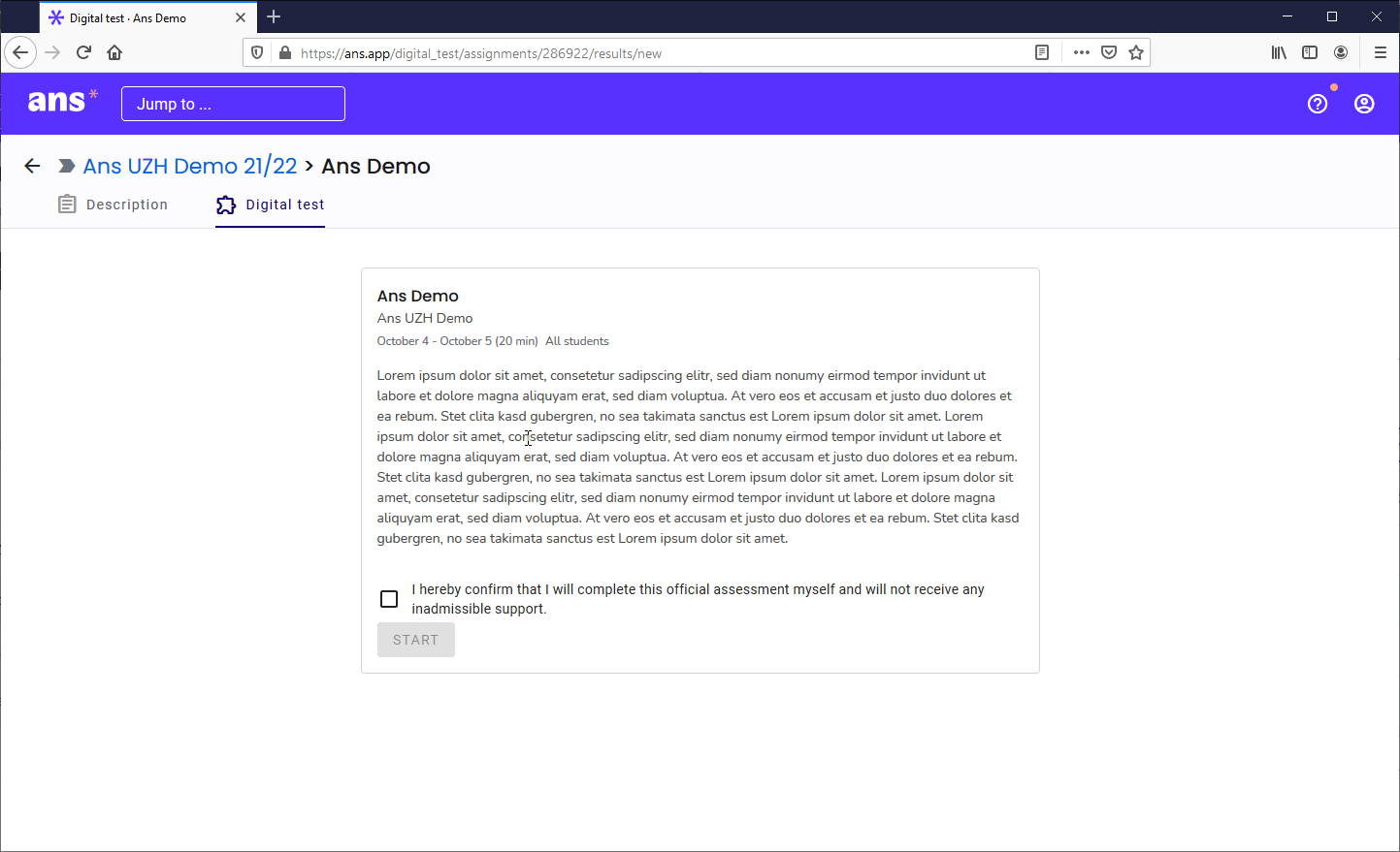 bei der Verwendung des Safe Exam Browser mit Ans ist das Starten der Prüfung anders. Mehr Informationen hierzu unter: Ans & SEB with Windows oder Ans & SEB with MacOS