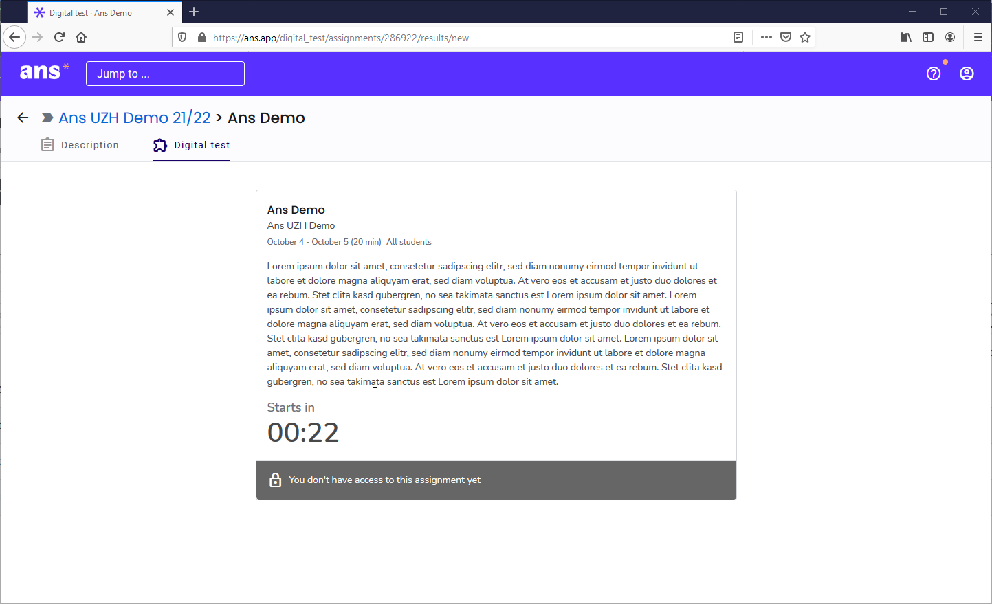 Wenn Sie auf die bevorstehende Prüfung (Scheduled Assignement) klicken, erscheint der Countdown: