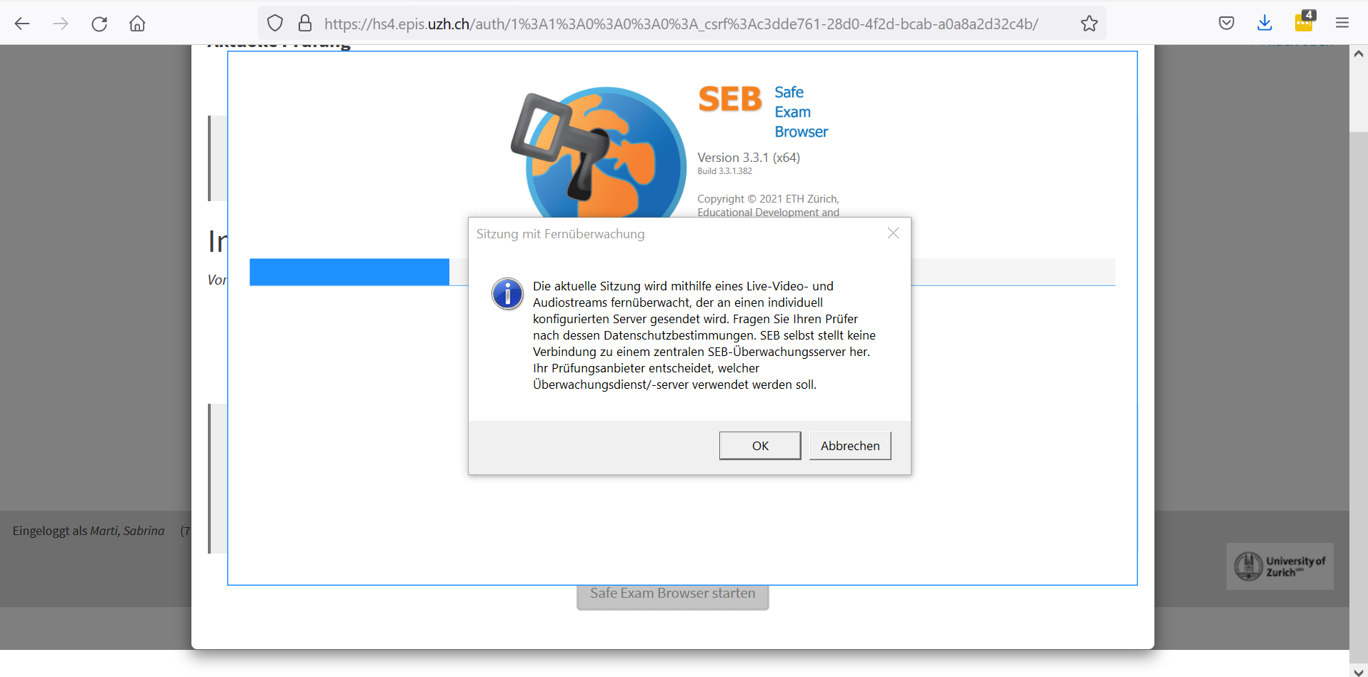 Während der SEB startet, zeigt sich ein Pop-up, welches darauf hinweist, dass eine Videoüberwachung stattfindet. Klicken Sie "OK".