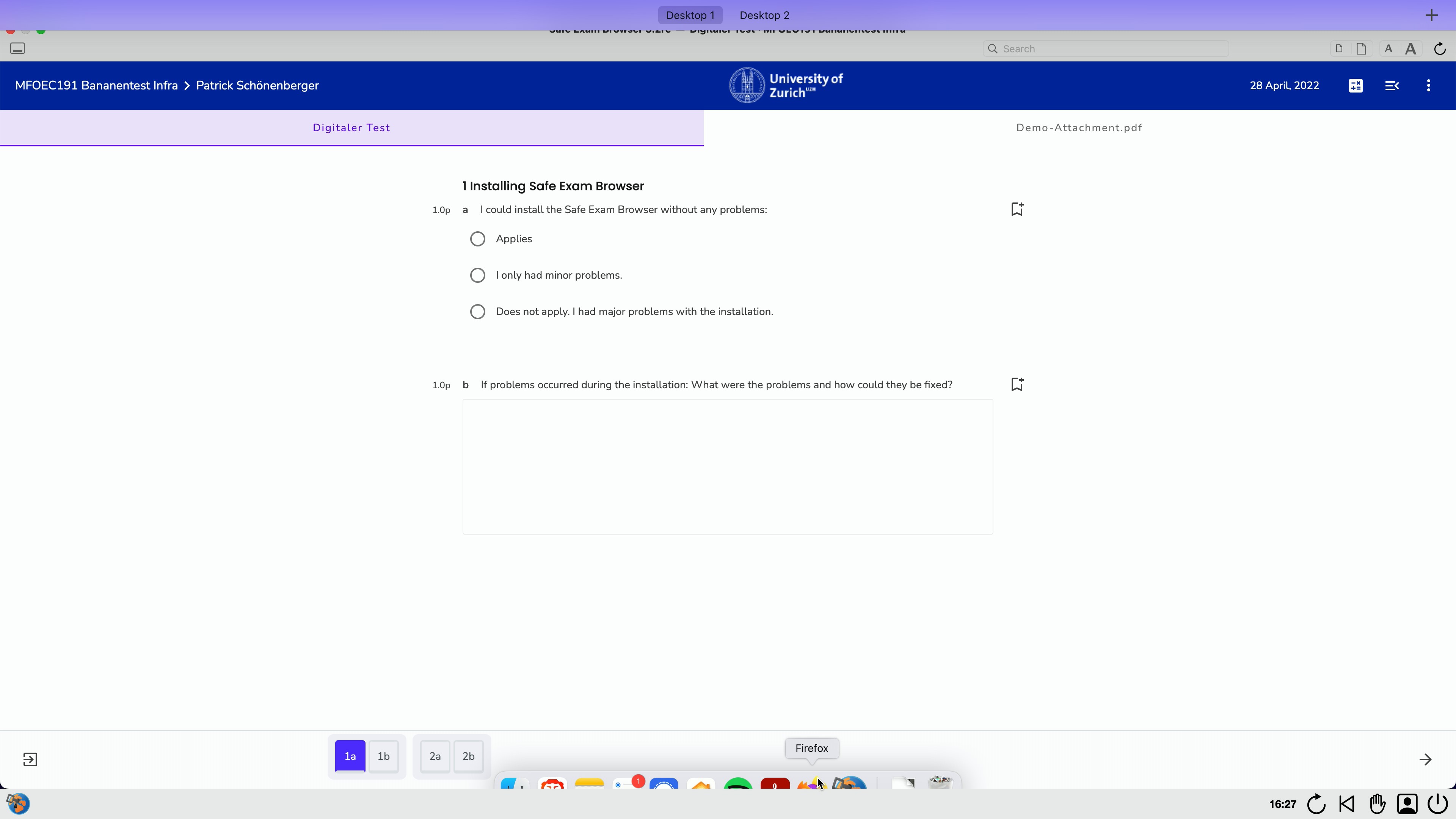 Es kann sein, dass Ihre Prüfung im Open Book Format durchgeführt wird. Abhängig von der gewählten Prüfung kann dies bedeuten, dass Sie Ihren Browser und andere Software (Word, PPT, PDF, etc.) verwenden dürfen. Da der SEB jedoch Ihre Toolbar respektive Ihr Dock ausblendet, müssen Sie das öffnen von Software in Open Book SEB Prüfungen vorgängig üben.