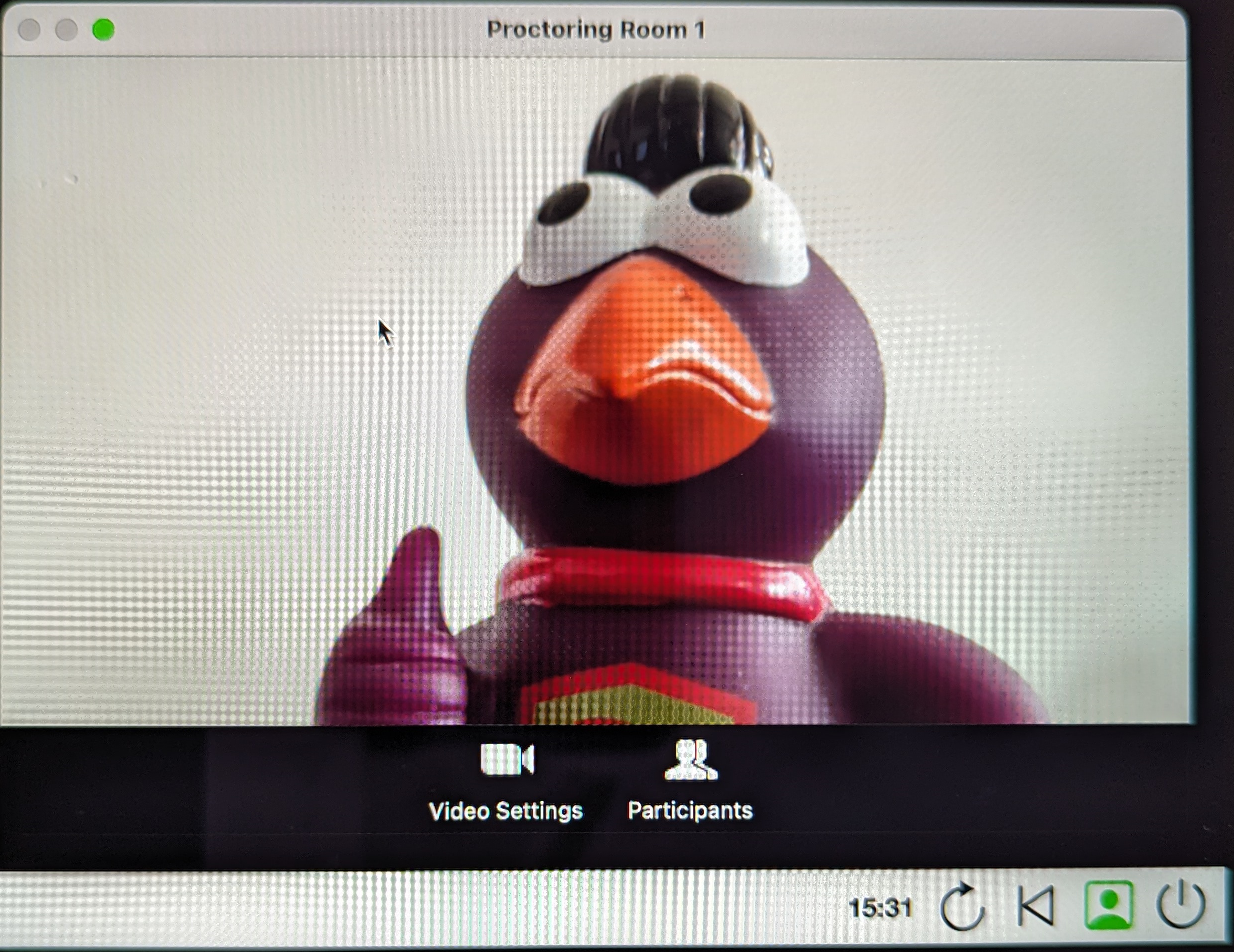 Das Kamerabild des Proctoring-Raums öffnet sich. Falls Sie alleine im Raum sind, sehen Sie nur sich selbst, sonst sehen Sie auch noch andere Studierende. Klicken Sie auf "Video Settings".