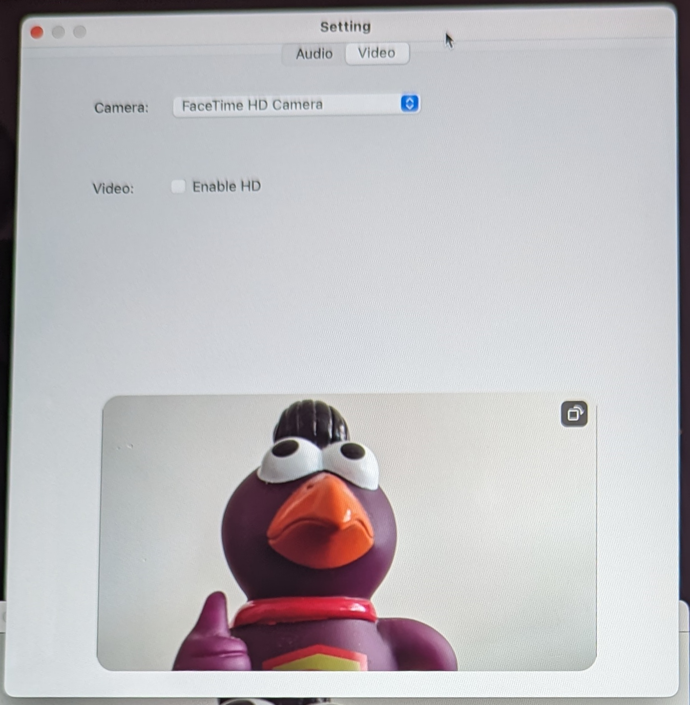Nun sehen Sie die Ton- und Videoeinstellungsmöglichkeiten. Klicken Sie oben rechts auf "Video". Es wird Ihnen nun angezeigt, welche Kamera verwendet wird und welches Bild zu sehen ist.
